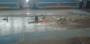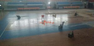 Υπενθυμίζεται ότι, εξαιτίας της έντονης βροχόπτωσης των προηγούμενων εβδομάδων, η οροφή της αθλητικής εγκατάστασης παρουσίασε διαρροές, με αποτέλεσμα να εισέλθουν νερά στον αγωνιστικό χώρο και το παρκέ να υποστεί σοβαρές φθορές. Οι εικόνες που είχαν δει το φως της δημοσιότητας τότε αποτύπωναν το μέγεθος του προβλήματος, προκαλώντας ανησυχία σε αθλητές, προπονητές και σωματεία που χρησιμοποιούν καθημερινά το γήπεδο.