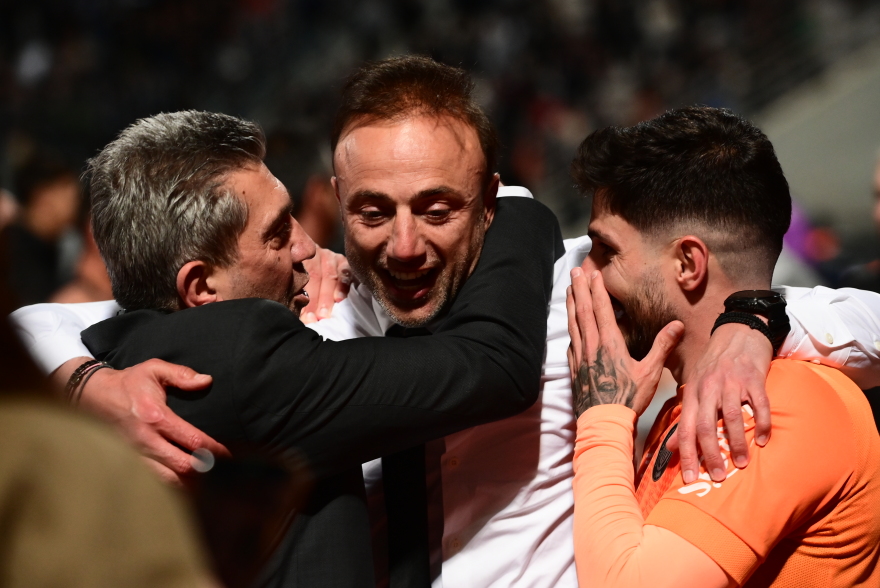 Ο αρχηγός Βασίλης Λαμπρόπουλος που δεν ξεκίνησε βασικός σήκωσε τα χέρια του Νίκου Τζώρτζογλου ο οποίος δάκρυσε.