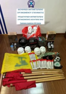 Όπως προέκυψε, το εν λόγω Στάδιο έχει παραχωρηθεί από την αρμόδια δημοτική Αρχή προς χρήση στην εν λόγω ομάδα, ενώ σε έρευνες που πραγματοποιήθηκαν σε κλειδωμένο χώρο του Σταδίου από αστυνομικούς του Τμήματος Ειδικών Ερευνών, με τη συνδρομή της Υποδιεύθυνσης Πληροφοριών και Ειδικών Δράσεων και παρουσία δικαστικού λειτουργού, συνολικά βρέθηκαν και κατασχέθηκαν: