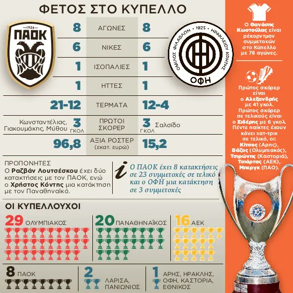 Το τρόπαιο που προσφέρει κι ένα σημαντικό ευρωπαϊκό εισιτήριο (για τα play offs του Europa League) διεκδικούν απόψε (20.30- cosmotesport1) στον 82ο τελικό του Κυπέλλου Ελλάδoς στο Πανθεσσαλικό ο ΠΑΟΚ με τον ΟΦΗ.