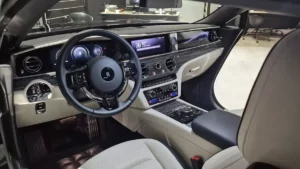 Στο πολυτελές εσωτερικό της κυριαρχούν υλικά υψηλών προδιαγραφών όπως ανθρακονήματα, μέταλλο και ξύλο, με ταπετσαρίες και φινιρίσματα που θέτουν νέα στάνταρ πολυτέλειας. Το ταμπλό σε μαύρο piano lacquer ενσωματώνει περίπου 5500 φωτιζόμενα αστέρια, δημιουργώντας ατμόσφαιρα μοναδική και συνδυάζοντας την τεχνολογία με την παράδοση της Rolls-Royce στη χειροτεχνία και την προσοχή στην κάθε λεπτομέρεια.