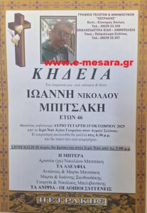 Η κηδεία του θα τελεστεί την Τετάρτη 15 Οκτωβρίου, στις 16:30, στον Ιερό Ναό Αγίου Γεωργίου στον Αγριλέ Σελίνου. Η σορός του θα βρίσκεται στον ναό από τις 15:00, ενώ η ταφή θα γίνει στο κοιμητήριο του χωριού.