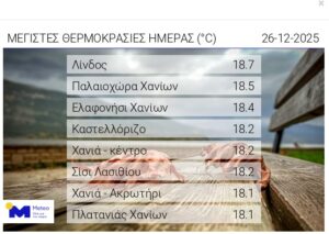 Ανοιξιάτικες θερμοκρασίες στα Χανιά – Στους 18 βαθμούς ο υδράργυρος σε πέντε περιοχές – Ήπιες καιρικές συνθήκες κατέγραψε το δίκτυο του meteo την Παρασκευή, με τον καιρό να θυμίζει περισσότερο άνοιξη παρά χειμώνα.