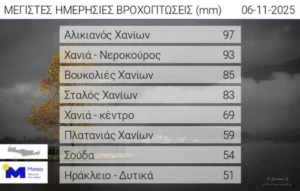 Ισχυρές βροχοπτώσεις σημειώθηκαν σε πολλές περιοχές της Κρήτης την Πέμπτη 6 Νοεμβρίου 2025, σύμφωνα με τα στοιχεία που δημοσιοποίησε ο Διευθυντής Ερευνών του Εθνικού Αστεροσκοπείου Αθηνών (ΕΑΑ), Κώστας Λαγουβάρδος.