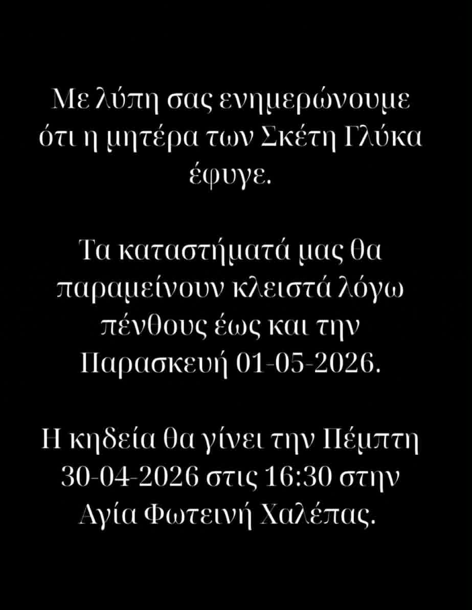 Βαρύ πένθος σκόρπισε στα Χανιά η είδηση της απώλειας της αγαπητής «κυρίας Τάνιας», μιας γυναίκας που είχε ταυτίσει το όνομά της με το γνωστό ζαχαροπλαστείο Σκέτη Γλύκα.