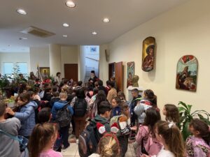 Ο Σεβασμιώτατος, πλαισιωμένος από τους συνεργάτες του, υποδέχθηκε με ιδιαίτερη χαρά τους μαθητές και τους εκπαιδευτικούς τους, απευθύνοντας ένα ουσιαστικό μήνυμα για το αληθινό νόημα της εορτής των Χριστουγέννων. Όπως τόνισε, «Χριστούγεννα δεν είναι τα δώρα, τα πλούσια γεύματα ή τα ταξίδια, αλλά το άνοιγμα της καρδιάς μας και η εμπιστοσύνη μας στον Χριστό που γεννάται για όλους και για τον καθένα προσωπικά».