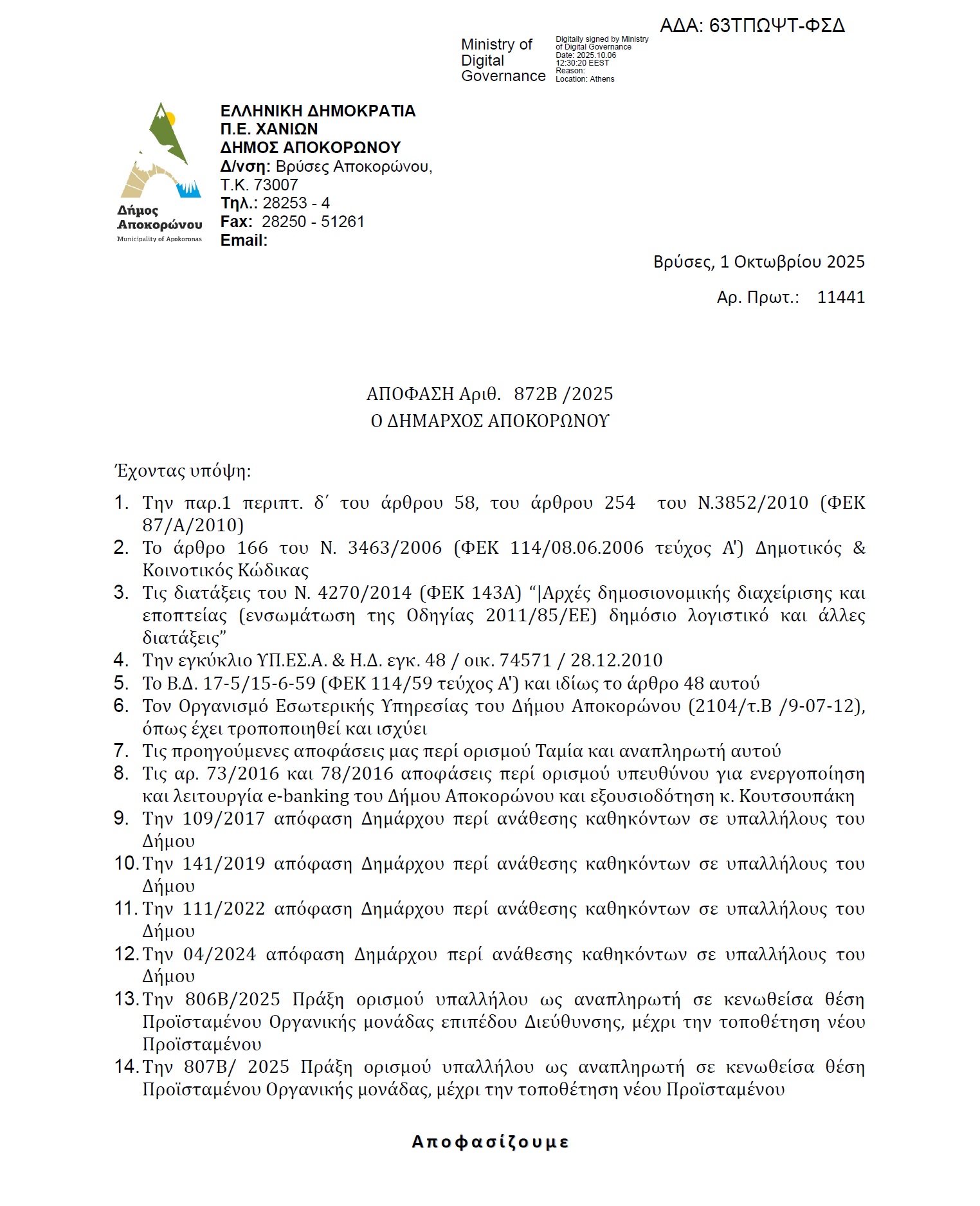 Ζήτημα λειτουργίας της διοίκησης του Δήμου Αποκορώνου θέτει η δημοτική παράταξη «Αλλάζουμε τον Αποκόρωνα», κάνοντας λόγο για σοβαρή διοικητική αστοχία που αφορά την έκδοση εγγράφων με τον ίδιο αριθμό πρωτοκόλλου.