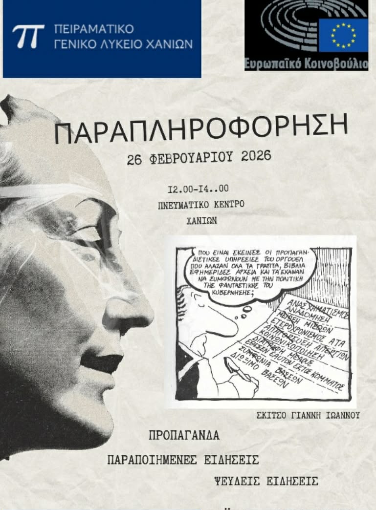 Εκδήλωση με επίκεντρο το κρίσιμο ζήτημα της παραπληροφόρησης διοργανώνουν την Πέμπτη 26 Φεβρουαρίου 2026 οι junior ambassadors του προγράμματος «Σχολεία-Πρέσβεις του Ευρωπαϊκού Κοινοβουλίου» του Πειραματικό Γενικό Λύκειο Χανίων.