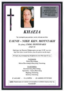 Σε ηλικία 85 ετών έφυγε από τη ζωή η Ελένη – Νίκη Μουντάκη, μητέρα του Χανιώτη δημοσιογράφου Νίκου Μουντάκη.