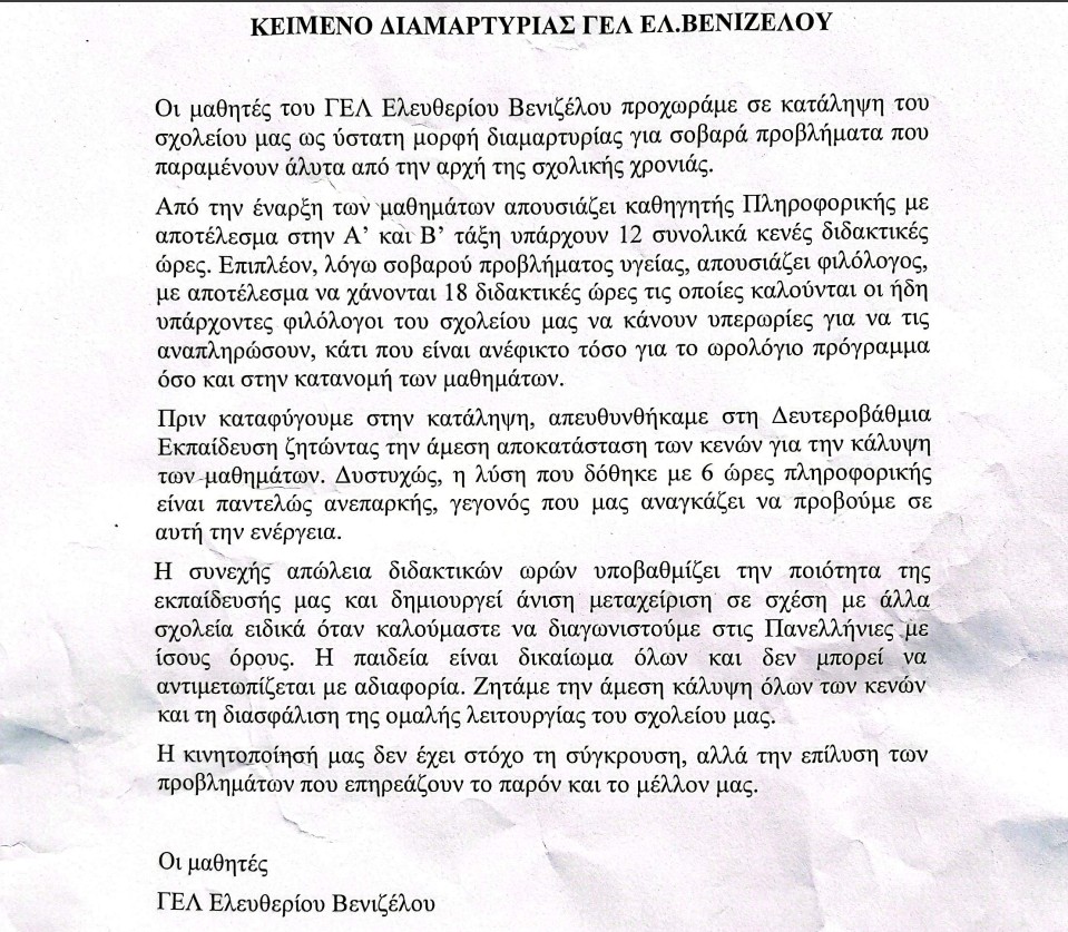Hashtags: #Χανιά #ΓΕΛΕλευθέριοςΒενιζέλος #Κατάληψη #Μαθητές #ΕλλείψειςΚαθηγητών #Πληροφορική #Εκπαίδευση