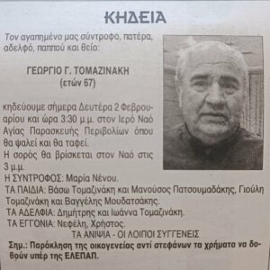 Σήμερα, το μεσημέρι, συγγενείς, φίλοι και συνεργάτες θα αποχαιρετήσουν τον Γιώργο Τομαζινάκη, τον γνωστό και αγαπητό μεταλλοκατασκευαστή των Χανίων, που έφυγε από τη ζωή σε ηλικία 67 ετών.