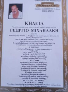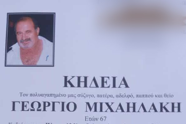 Ο Γιώργος Μιχαηλάκης έφυγε από τη ζωή την Τρίτη, νοσηλευόμενος στο Νοσοκομείο Χανίων, σκορπίζοντας θλίψη στην οικογένειά του και στην τοπική κοινωνία, όπου ήταν ιδιαίτερα γνωστός και αγαπητός.