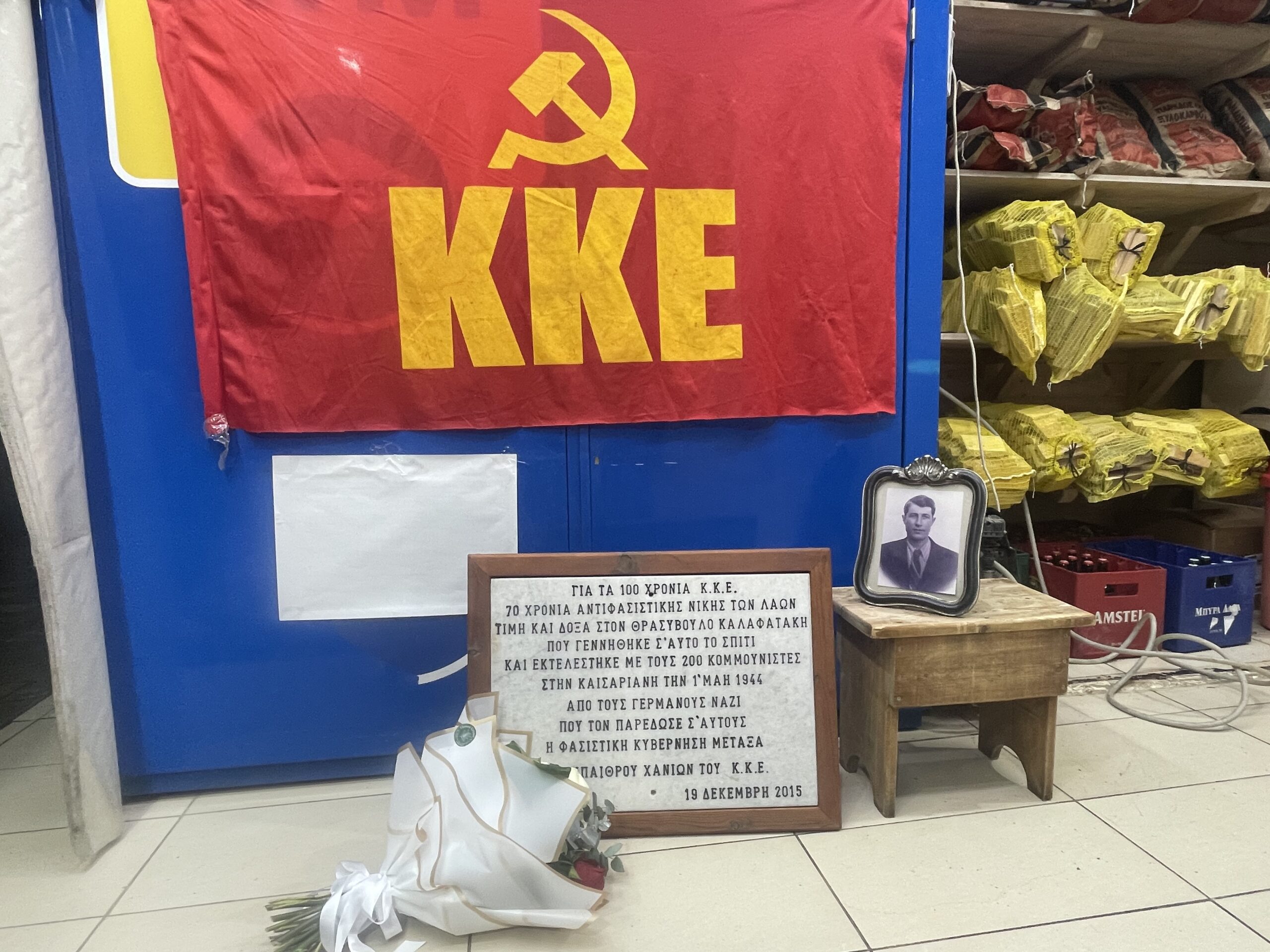 «Επισκεφθήκαμε σήμερα το σπίτι του Θρασύβουλου Καλαφατάκη, στον Πλατανιά Κυδωνίας, όπου δέκα χρόνια πριν είχαμε τοποθετήσει τιμητική πλάκα στη μνήμη του, καθώς, ως γνωστόν, ήταν ένας από τους 200 κομμουνιστές που εκτελέστηκαν στην Καισαριανή από τους Γερμανούς Ναζί, την Πρωτομαγιά του 1944.