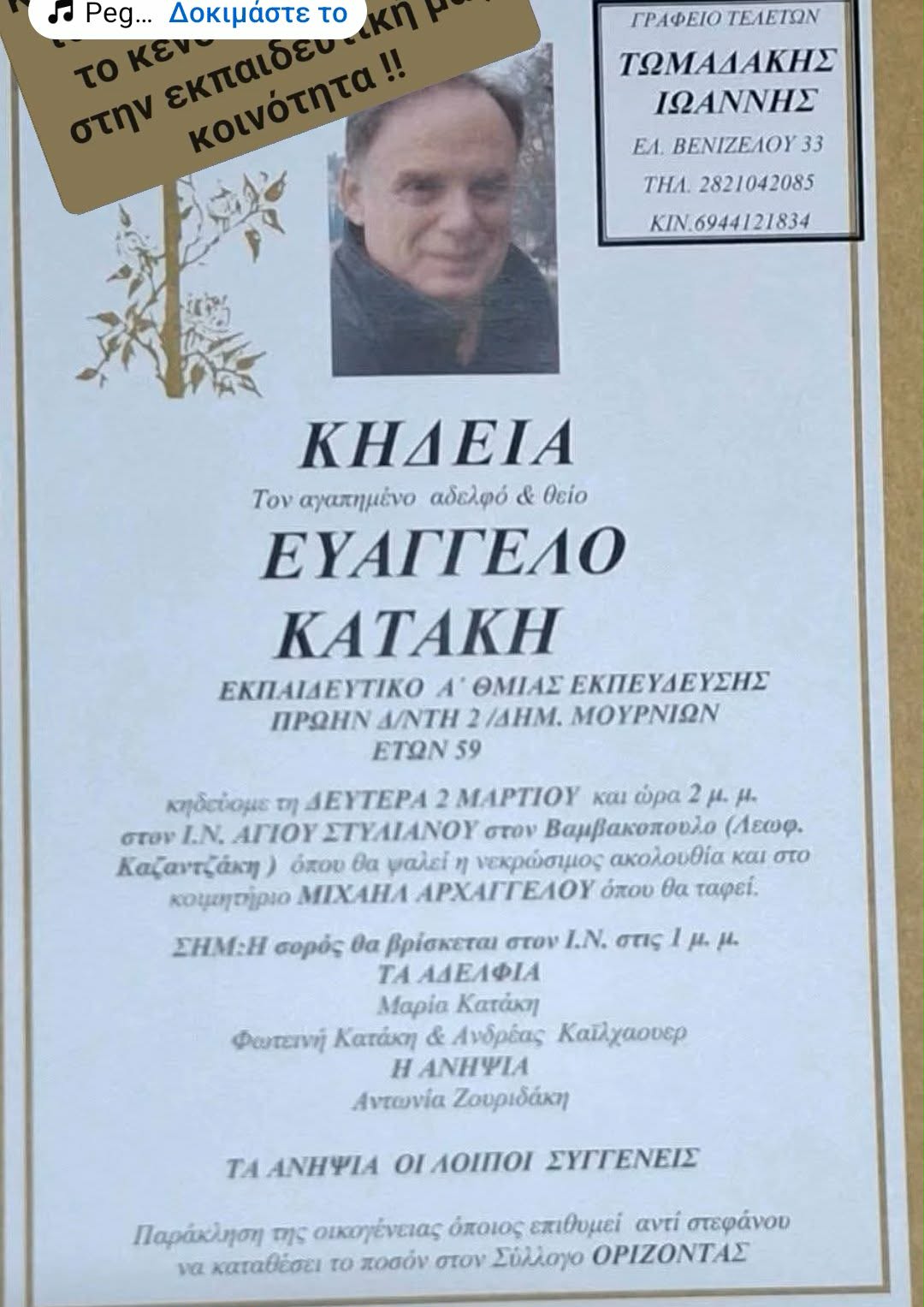 Με συλλυπητήριο ψήφισμα, ο Σύλλογος Εκπαιδευτικών Πρωτοβάθμιας Εκπαίδευσης Χανίων (ΣΕΠΕ Χανίων) εκφράζει τη βαθιά του οδύνη για τον θάνατο του εκπαιδευτικού Ευάγγελου Κατάκη.