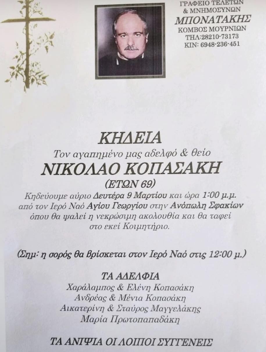 Θλίψη έχει προκαλέσει στην τοπική κοινωνία των Σφακίων η είδηση του θανάτου του Νικόλαου Κοπασάκη, ο οποίος έφυγε από τη ζωή σε ηλικία 69 ετών.