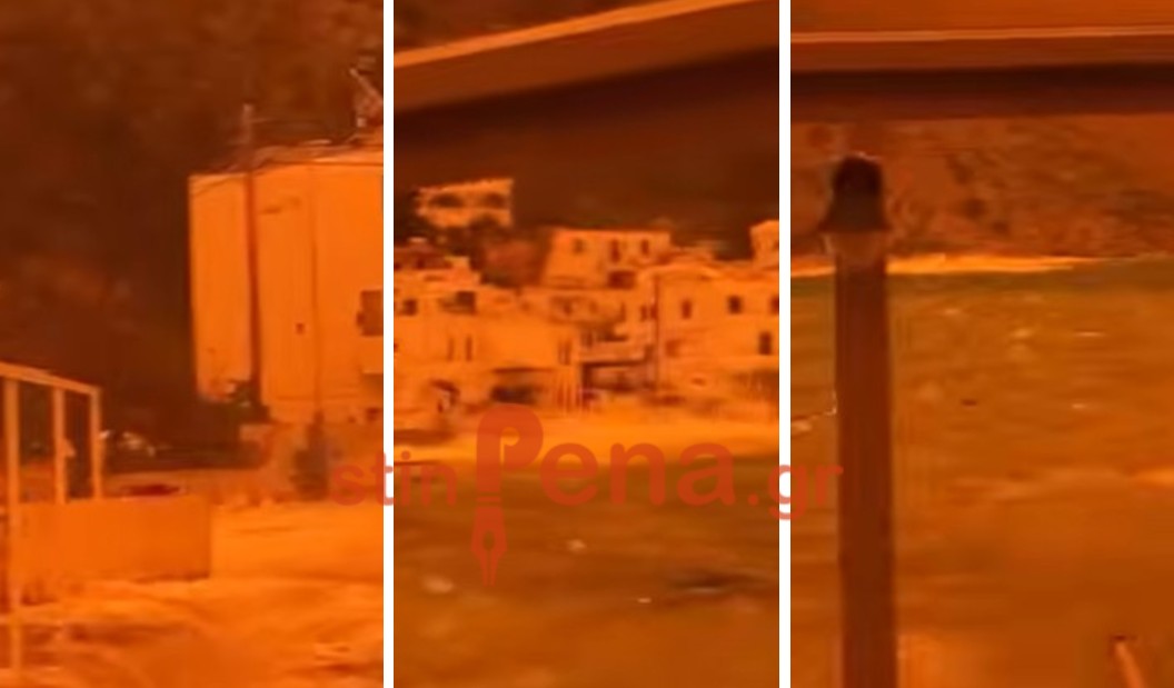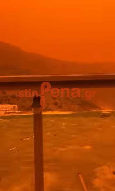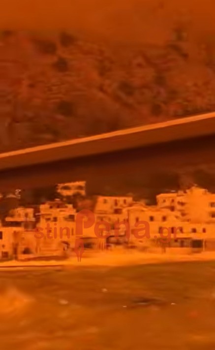 Εντυπωσιακές αλλά και άγριες εικόνες καταγράφονται στο Λουτρό Σφακίων, όπου η αφρικανική σκόνη έχει μετατρέψει τον ουρανό σε ένα βαθύ κόκκινο σκηνικό, δημιουργώντας μια σχεδόν απόκοσμη ατμόσφαιρα.