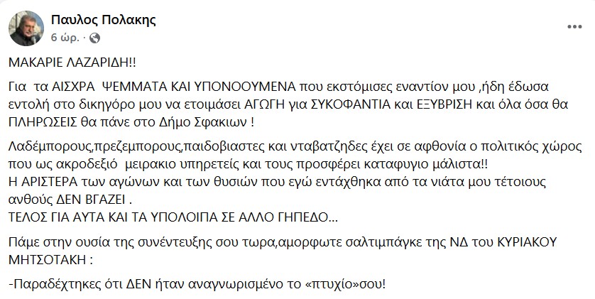 Ο κ. Πολάκης, μέσω ανάρτησής του, εξαπολύει σειρά καταγγελιών και προσωπικών αιχμών, προαναγγέλλοντας παράλληλα νομικές ενέργειες, ενώ η τοποθέτησή του κινείται σε οξύ ύφος και αγγίζει ζητήματα που αφορούν τόσο τον δημόσιο λόγο όσο και στοιχεία του βιογραφικού του υφυπουργού. Η ανάρτηση δε κλείνει με τον κ. Πολάκη ν’ αναφέρει χαρακτηριστικά: “Γύρευε δηλαδή με τι κρατάει ο Μακάριος τον Κυριάκο!“