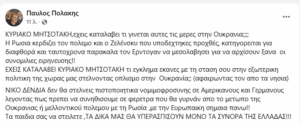 Επίθεση κατά του Κυριάκου Μητσοτάκη και του υπουργού Άμυνας Νίκου Δένδια εξαπολύει ο Παύλος Πολάκης, με ανάρτηση όπου σχολιάζει τις εξελίξεις στον πόλεμο της Ουκρανίας και τη στάση της ελληνικής κυβέρνησης.