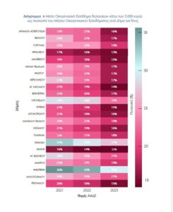 Όπως τονίζεται στην έρευνα του Παρατηρητηρίου, ο δείκτης της αναλογίας φορολογικών δηλώσεων κάτω των 5.000 ευρώ προς το σύνολο των δηλώσεων ανά Δήμο και έτος, αποτυπώνει την έκταση της φτώχειας σε κάθε Δήμο και την εξέλιξή της με την πάροδο του χρόνου την περίοδο 2021-2023 -δηλαδή, αν περιορίζεται ή διευρύνεται η ομάδα των νοικοκυριών με πολύ χαμηλά εισοδήματα, τα οποία βρίσκονται κάτω από το κατώφλι φτώχειας (ΕΛΣΤΑΤ).
