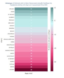 Οι μεγαλύτερες μειώσεις σημειώνονται στους Δήμους Μινώα Πεδιάδας −12%, Αγίου Νικολάου −11%, Βιάννου −11% και Ηρακλείου −9%, γεγονός που δείχνει επιδείνωση της οικονομικής κατάστασης των πιο χαμηλών εισοδημάτων.