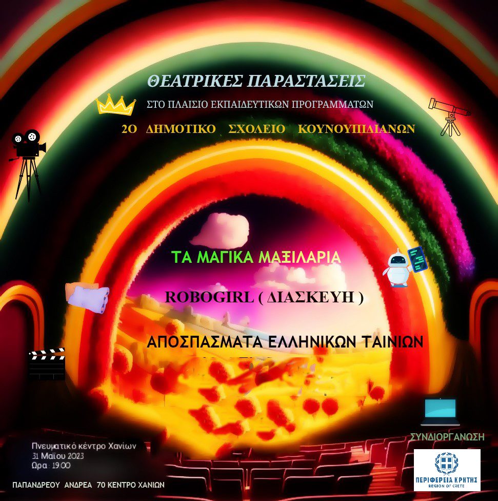 Την Παρασκευή 21 Ιουλίου 2023, στις 21:00 στην Πλατεία Αγίου Γεωργίου στο Κατωχώρι της Δ.Ε. Κεραμιών και την Κυριακή 23 Ιουλίου 2023, στις 21.00, στην Πλατεία στο Χορδάκι της Δ.Ε. Ακρωτηρίου.