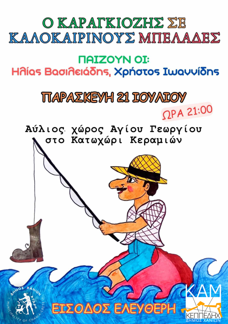 Την παράσταση «Τα καλοκαιρινά κατορθώματα του Καραγκιόζη» προσφέρουν ο Δήμος Χανίων και η Κ.Ε.Π.ΠΕ.ΔΗ.Χ.-Κ.Α.Μ. με ελεύθερη είσοδο για μικρούς και μεγάλους σε δύο παραστάσεις σε χωριά του Δήμου μας.