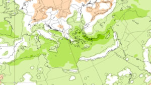 Στο υπόλοιπο ελληνικό έδαφος η τάση δείχνει υετικές τιμές κοντά ή λίγο πάνω από το κανονικό, με εξαίρεση ορεινές ζώνες της δυτικής και βόρειας χώρας όπου οι αποκλίσεις είναι ουδέτερες — ένδειξη ότι τα κύρια περάσματα θα κινούνται ελαφρώς νοτιοανατολικότερα.