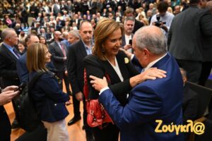 Θερμή χειραψία με εναγκαλισμό είχε ο πρώην πρωθυπουργός με τη Ντόρα Μπακογιάννη