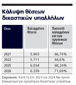 Σύμφωνα με αυτά τα στοιχεία, το 2021 το ποσοστό καλυμμένων οργανικών θέσεων δικαστικών υπαλλήλων ανερχόταν σε 66,76%, ενώ το 2026 προβλέπεται ότι αυτό θα φτάσει στο 71,69%. Παρά τις αποχωρήσεις, συνταξιοδοτήσεις και παραιτήσεις δικαστικών υπαλλήλων, την τελευταία τριετία παρατηρείται αύξηση περίπου 5% στην κάλυψη των θέσεων. Να ληφθεί υπόψη ότι οι συνολικές οργανικές θέσεις δικαστικών υπαλλήλων στα Πολιτικά, Ποινικά και Διοικητικά Δικαστήρια της χώρας ανέρχονται σε 8.842.