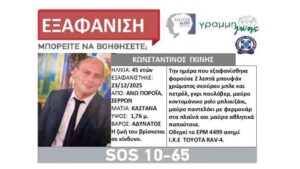 Σύμφωνα με πληροφορίες, ο Κωνσταντίνος Γκίνης έφυγε από το σπίτι του χωρίς να πάρει μαζί του κινητό τηλέφωνο ή πορτοφόλι, κάτι που εντείνει την αγωνία.
