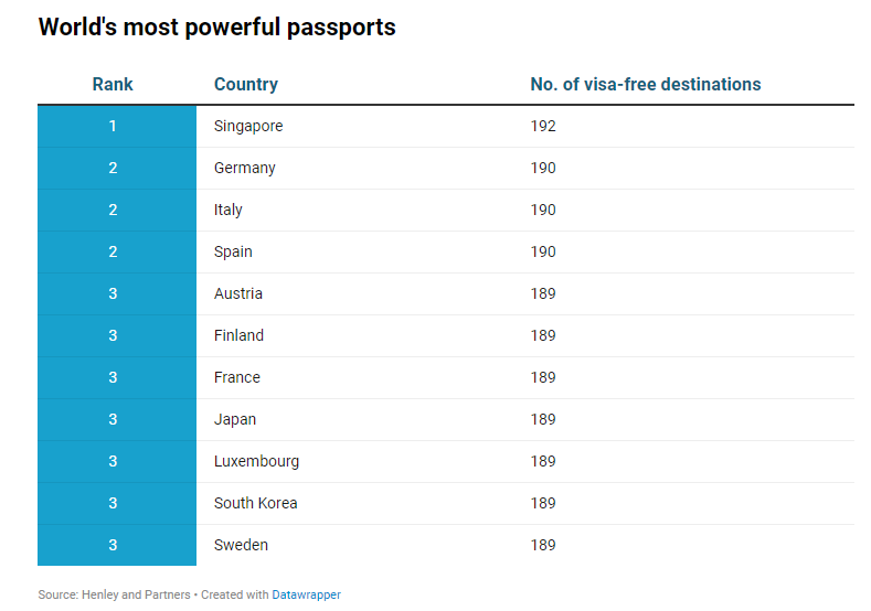 Το διαβατήριο της Σιγκαπούρης ήταν επίσης στην πρώτη θέση το 2021 με πρόσβαση σε 194 προορισμούς, αλλά έπεσε στη δεύτερη θέση πέρυσι. Τα τελευταία 10 χρόνια, η Σιγκαπούρη αύξησε τη βαθμολογία της κατά 25 προορισμούς, ανεβάζοντας τη χώρα κατά πέντε θέσεις για να φτάσει στην κορυφή.