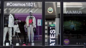 Αναπηρικά αμαξίδια ‒προσφερόμενα από εταιρείες, φορείς και πολίτες‒ στέκονται στατικά σε βιτρίνες καταστημάτων, δίπλα σε ρούχα, παπούτσια, λευκά είδη, αντικείμενα της καθημερινότητας.