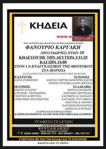 Η κηδεία του Φανούρη Καργάκη – γράφει το e-mesara – θα τελεστεί σήμερα, Δευτέρα 3 Νοεμβρίου, στις 14:00, στον Ιερό Ναό Ευαγγελισμού της Θεοτόκου στα Βορίζια, παρουσία πλήθους κόσμου που αναμένεται να αποχαιρετήσει τον 39χρονο για τελευταία φορά.