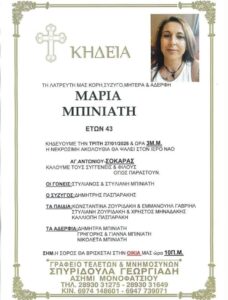 Για τον θάνατο της 43χρονης Μαρίας Μπινιάτη