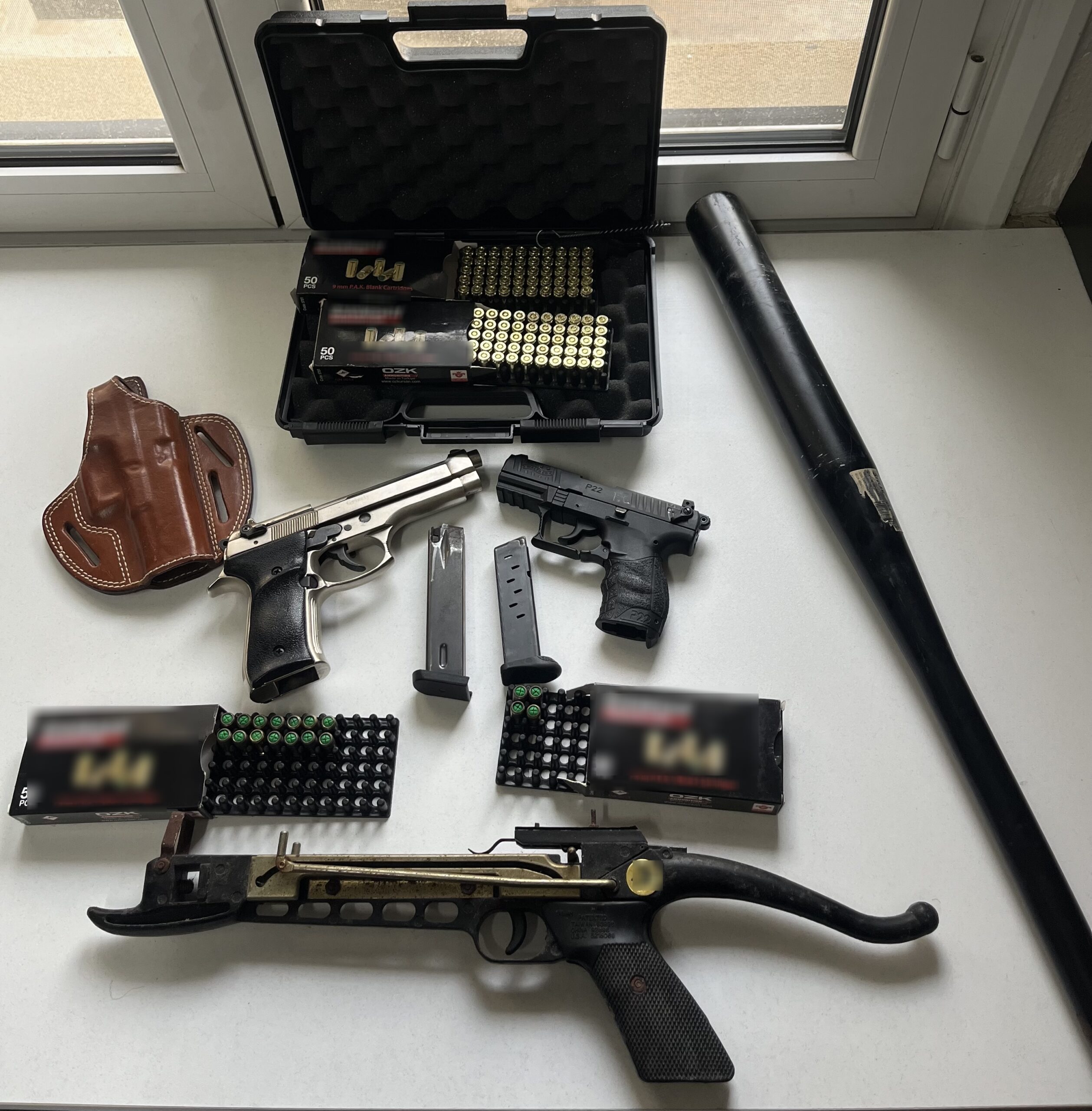 Κατά τη διάρκεια συντονισμένων ερευνών στις οικίες τους, από αστυνομικούς του Τμήματος Χερσονήσου και της ΟΠΚΕ, εντοπίστηκαν και κατασχέθηκαν δύο πιστόλια με γεμιστήρες, 100 φυσίγγια, 18 κάλυκες, καθώς και βαλλίστρα και μεταλλικό ρόπαλο.