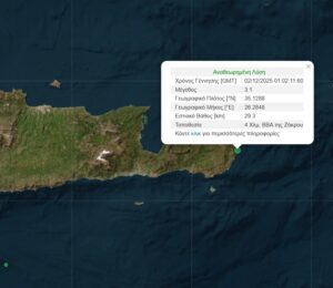Δύο διαδοχικές σεισμικές δονήσεις καταγράφηκαν τα ξημερώματα της Τρίτης (2/12) στην Κρήτη, προκαλώντας ανησυχία — αν και δεν αναφέρθηκαν ζημιές ή τραυματισμοί.