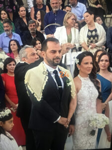 Το ζευγάρι πάντρεψαν ο δικηγόρος και αντιπεριφερειάρχης Νίκος Σκουλάς και ο φίλος του γαμπρού Γιώργος Παπουτσάκης που έδωσαν και ρεσιτάλ χορού στο γλέντι που έγινε στους «Κουρήτες».