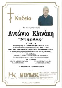 Βαρύ είναι το κλίμα στο Ηράκλειο από την είδηση του θανάτου του Αντώνη Κλινάκη, γνωστού και ιδιαίτερα αγαπητού ως «Ντήρλας», ο οποίος έφυγε από τη ζωή σε ηλικία 78 ετών.