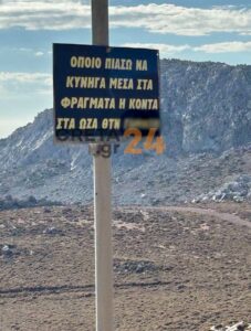 Στα Αστερούσια, κοντά στο χωριό Εθιά, μπορεί να συναντήσει κανείς μια… ιδιαίτερη πινακίδα η οποία ”στέλνει” -με έναν όχι και τόσο ευγενικό τρόπο – μήνυμα στους κυνηγούς.