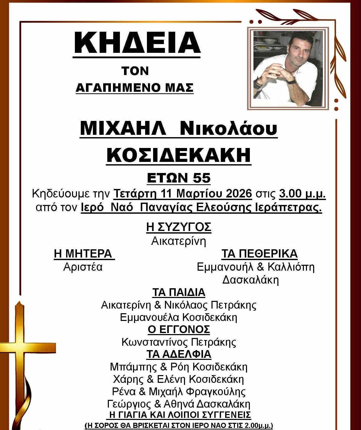 Θλίψη σκόρπισε στην Ιεράπετρα η είδηση του θανάτου του Μιχαήλ Νικολάου Κοσιδεκάκη, ο οποίος έφυγε από τη ζωή σε ηλικία 55 ετών, αφήνοντας πίσω του την οικογένεια, συγγενείς και φίλους που τον αποχαιρετούν με οδύνη.