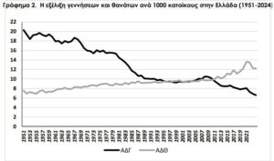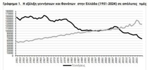 Ωστόσο, από τις αρχές της δεκαετίας του 2010 η κατάσταση αντιστράφηκε: Οι θάνατοι ξεπέρασαν σταθερά τις γεννήσεις (+4,3 χιλ. το 2011, +58,5 χιλ. το 2024), οδηγώντας σε αρνητικά φυσικά ισοζύγια που, συνολικά, φτάνουν τους 510.000 περισσότερους θανάτους από γεννήσεις την περίοδο 2011–2024. Η ΕΛΣΤΑΤ εκτιμά ότι η Ελλάδα έχει χάσει περίπου 715.000 κατοίκους από τη μείωση του πληθυσμού, κυρίως λόγω αυτής της δημογραφικής τάσης, όπως αναφέρει το ygeiamou.gr.