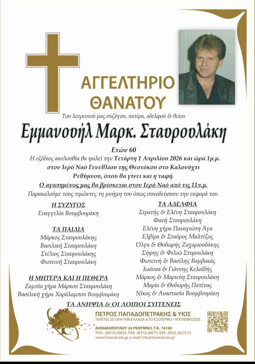 Στο πένθος έχει βυθιστεί η τοπική κοινωνία στο Ρέθυμνο για την απώλεια του Μανόλη Σταυρουλάκη, ο οποίος έφυγε από τη ζωή σε ηλικία 60 ετών.