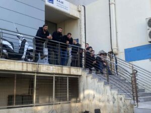 Αντιπροσωπεία των διαμαρτυρόμενων έφτασε με αγροτικά οχήματα στα γραφεία της ΔΟΥ στο κέντρο του Ρεθύμνου, όπου με λουκέτο έκλεισαν για λίγη ώρα την είσοδο, ενώ με πανό εξέφρασαν την εναντίωσή τους στη διαχείριση του κράτους ως προς τον πρωτογενή τομέα.