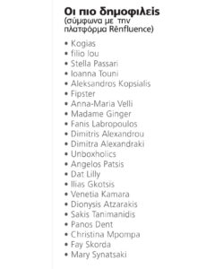 –Mega-influencers (άνω των 500.000 followers): Είναι celebrities, πολλές φορές με τηλεοπτική ή δημοσιογραφική πορεία. Οι συνεργασίες μαζί τους ξεκινούν από 4.000 ευρώ ανά καμπάνια και αγγίζουν τα 30.000 ευρώ για μηνιαία συμβόλαια. Τα brands τούς βλέπουν ως ασφαλή επένδυση προβολής. Οχι πάντα ως value for money.
