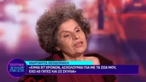 Και συνέχισε: «Αυτή την τάση την ξεπέρασα τα τελευταία 20 χρόνια, μόνο. Νομίζω ότι υπάρχει μια μερίδα ανθρώπων που είναι αυτοκτονικοί. Το ξεπέρασα, σίγουρα, γιατί ωρίμασα. Παράλληλα ήμουν και πολύ αισιόδοξη, πέρασα και την περίοδο του έρωτα μέχρι τα 50. Το έζησα, τα έζησα όλα, σαν κάθε άνθρωπος. Ήμουν και εγώ εκρηκτική και χαρούμενη και ευτυχισμένη αλλά οι τάσεις αυτοκτονίας είναι κάτι εσωτερικό που θέλει ψυχανάλυση».