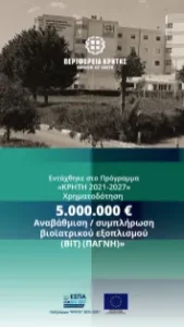 Η δράση, συνολικού προϋπολογισμού 5.000.000 ευρώ, χρηματοδοτείται από το Ευρωπαϊκό Ταμείο Περιφερειακής Ανάπτυξης (ΕΤΠΑ) στο πλαίσιο του Προγράμματος «Κρήτη» 2021-2027.