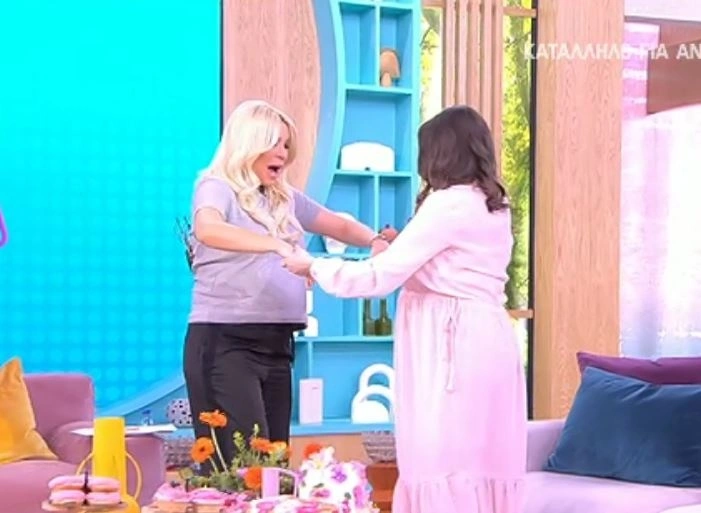 «Θα σηκωθώ να σε πάρω αγκαλιά… Με το καλό. Εσύ είσαι έγκυος», είπε στη συνέχεια η παρουσιάστρια.