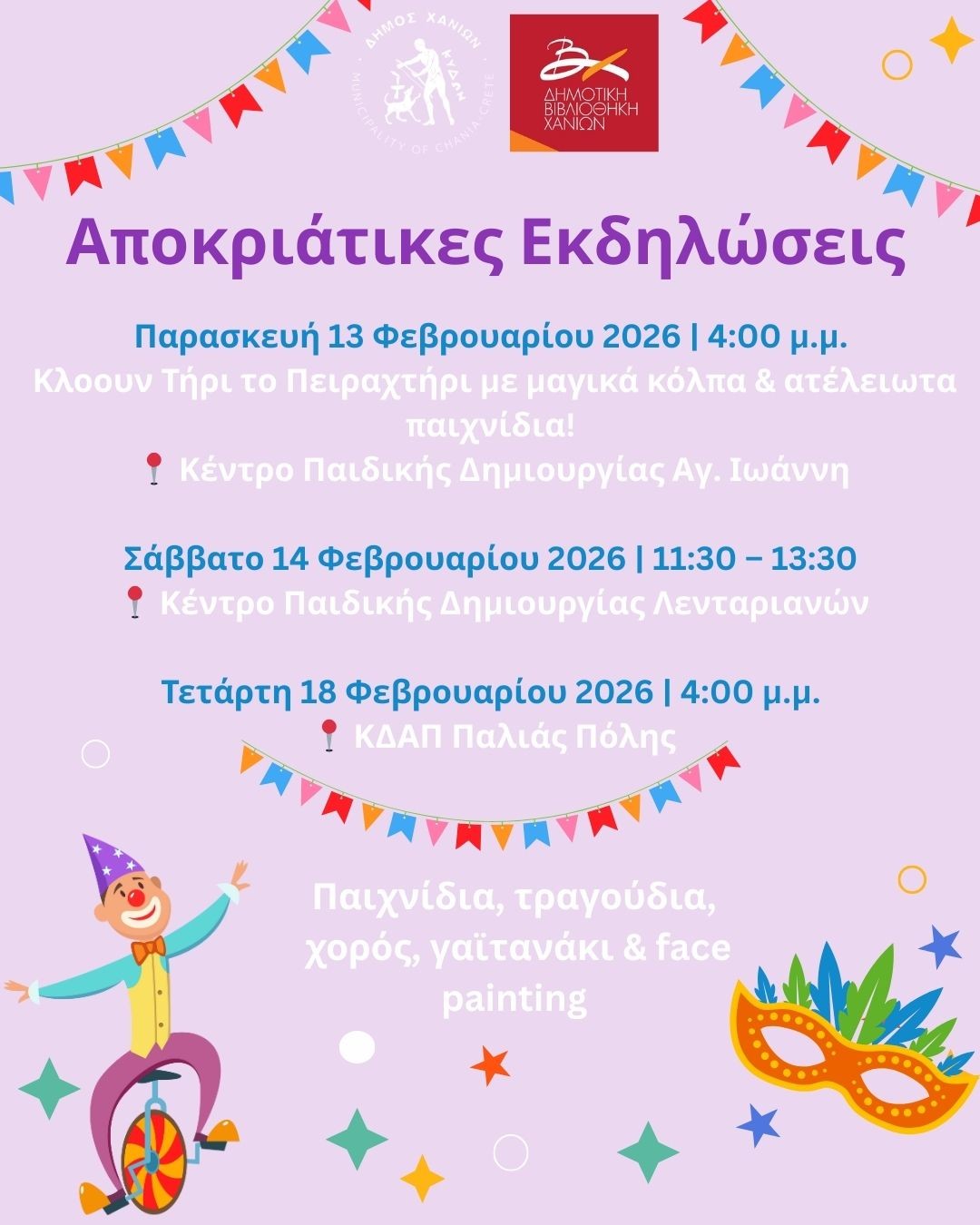 Το 1ο Πειραματικό Γυμνάσιο Χανίων διοργανώνει Σχολική Γιορτή Αφιερωμένη στο 1821, με τίτλο: Με Πίστη και Ελπίδα, Μεγάλοι Ήρωες …από Μικροι τη Δευτέρα 24 Μαρτίου 2025, ώρα 9.15 π.μ., στο Πνευματικό Κέντρο Χανίων. Συνδιοργάνωση: Περιφέρεια Κρήτης – Περιφερειακή Ενότητα Χανίων....