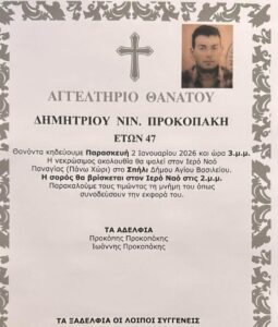 Βυθισμένη στο πένθος είναι η κοινωνία του Ρεθύμνου, μετά την απώλεια του Δημήτρη Προκοπάκη, ο οποίος έφυγε πρόωρα από τη ζωή σε ηλικία μόλις 47 ετών. Η είδηση του θανάτου του προκάλεσε βαθιά οδύνη σε συγγενείς, φίλους και σε όσους τον γνώριζαν, αφήνοντας ένα δυσαναπλήρωτο κενό στην τοπική κοινωνία.