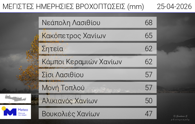 Σύμφωνα με τις καταγραφές του δικτύου αυτόματων μετεωρολογικών σταθμών του Εθνικού Αστεροσκοπείου Αθηνών / meteo.gr το μεγαλύτερο ύψος βροχής έως τις 19:30 περίπου καταγράφηκε στη Νεάπολη Λασιθίου και είναι ίσο με 68 χιλιοστά.